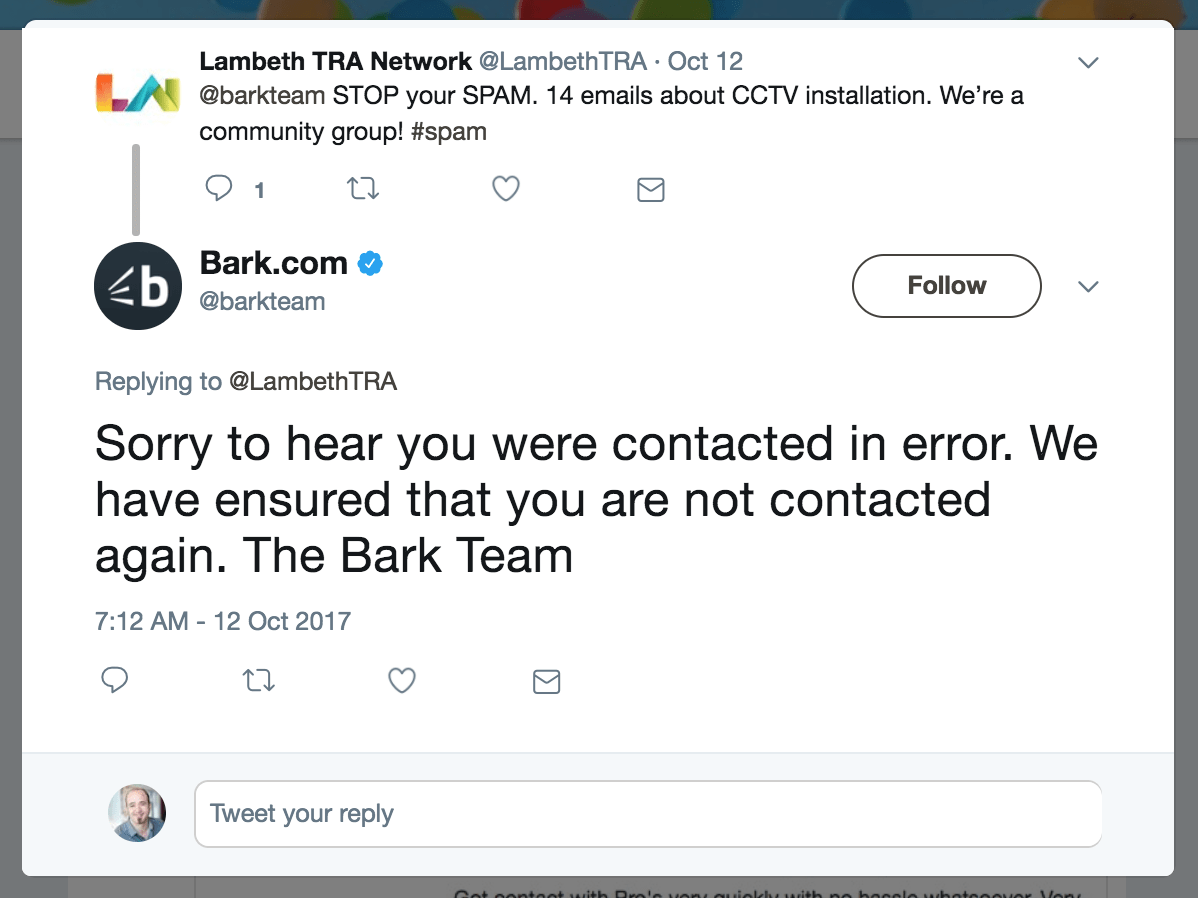 When I queried Bark via DM about where they got my contact details and informed them that spamming is illegal in the UK, their response was that they are operating within the laws of the UK. I believe this: I am not suggesting at all that Bark are breaking the law, I don’t think they are.
